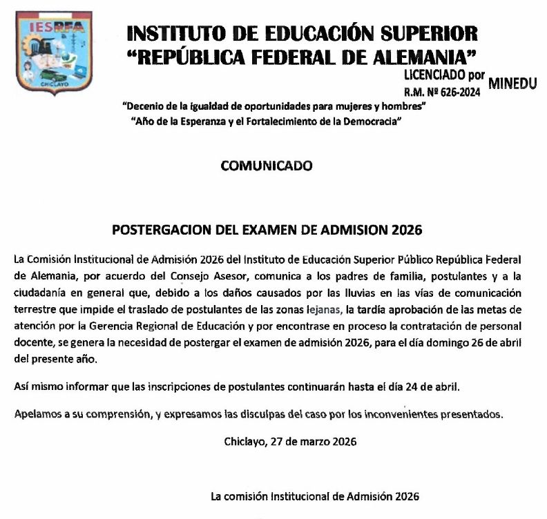 EXAMEN DE ADMISIÓN: 26 DE ABRIL